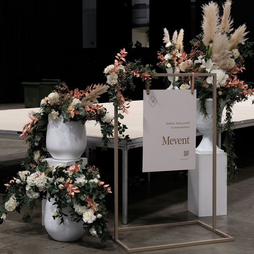 Tyylikäs metallinen kylttiteline esimerkiksi tervetuloa -kyltille tai pöytäkartalle. Ihanteellinen kylttikoko telineeseen olisi korkeus 70 cm x leveys 50 cm (vaaka).