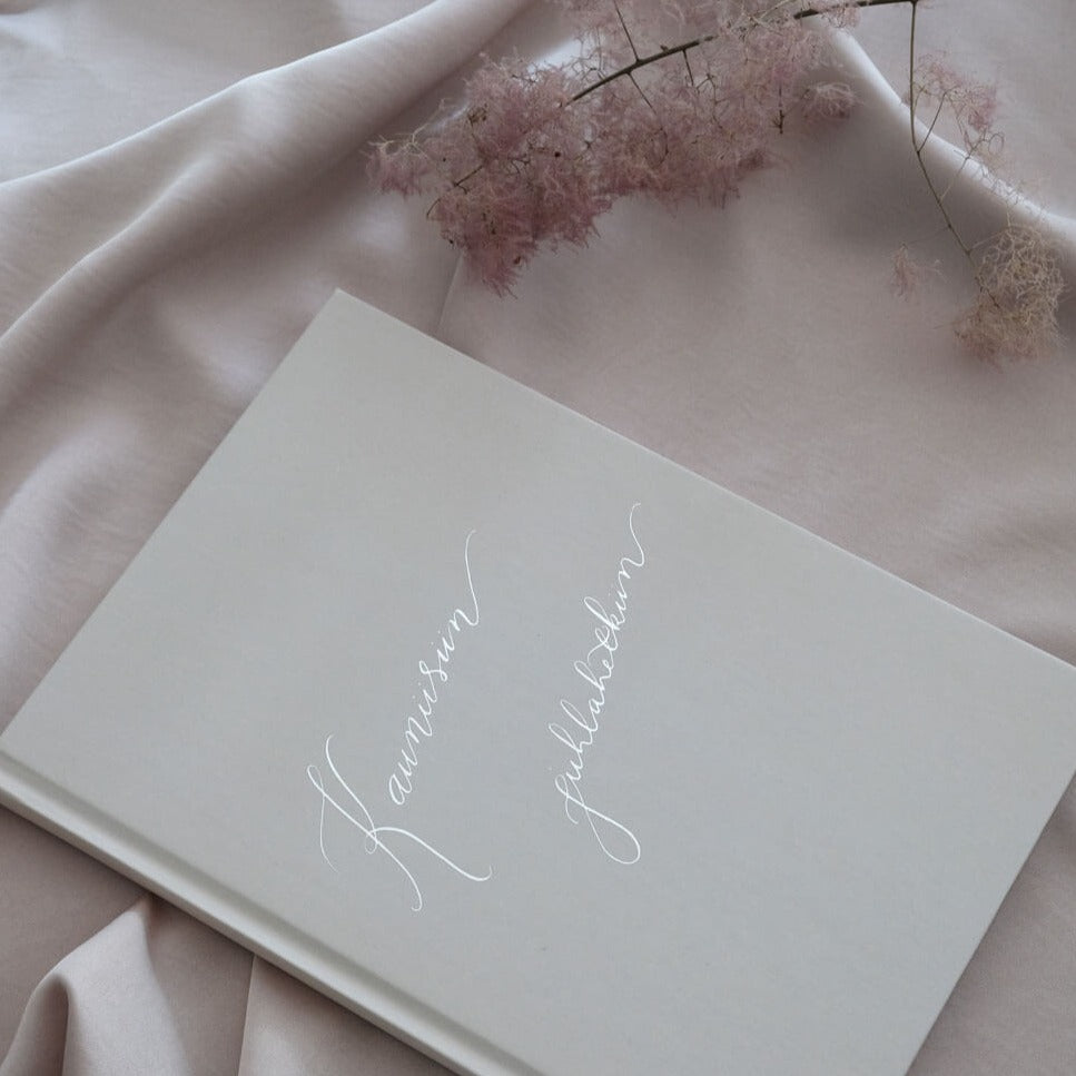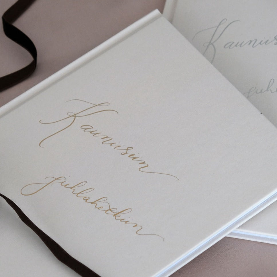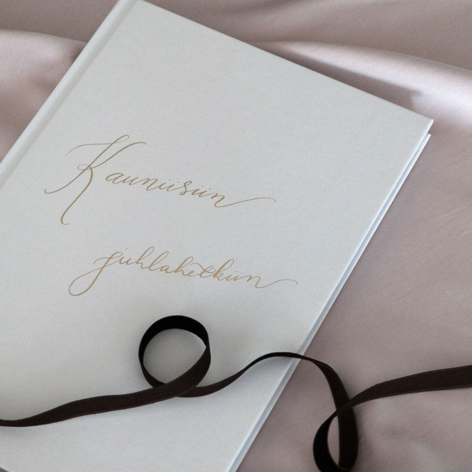 Elegantti vieraskirja tekstillä "Kauniisiin juhlahetkiin". Voit valita tekstin joko kullan- tai hopeanvärisenä.