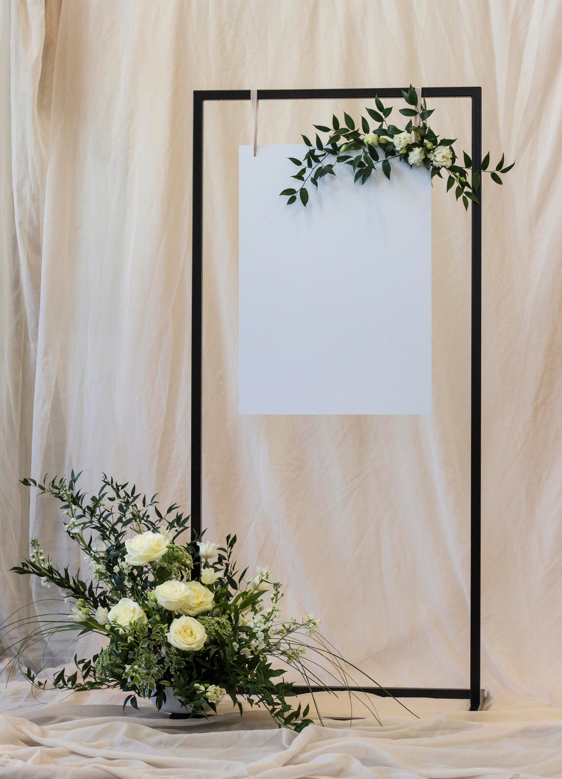 Tyylikäs metallinen kylttiteline esimerkiksi tervetuloa -kyltille tai pöytäkartalle. Ihanteellinen kylttikoko telineeseen olisi korkeus 100 cm x leveys 70 cm (pysty).